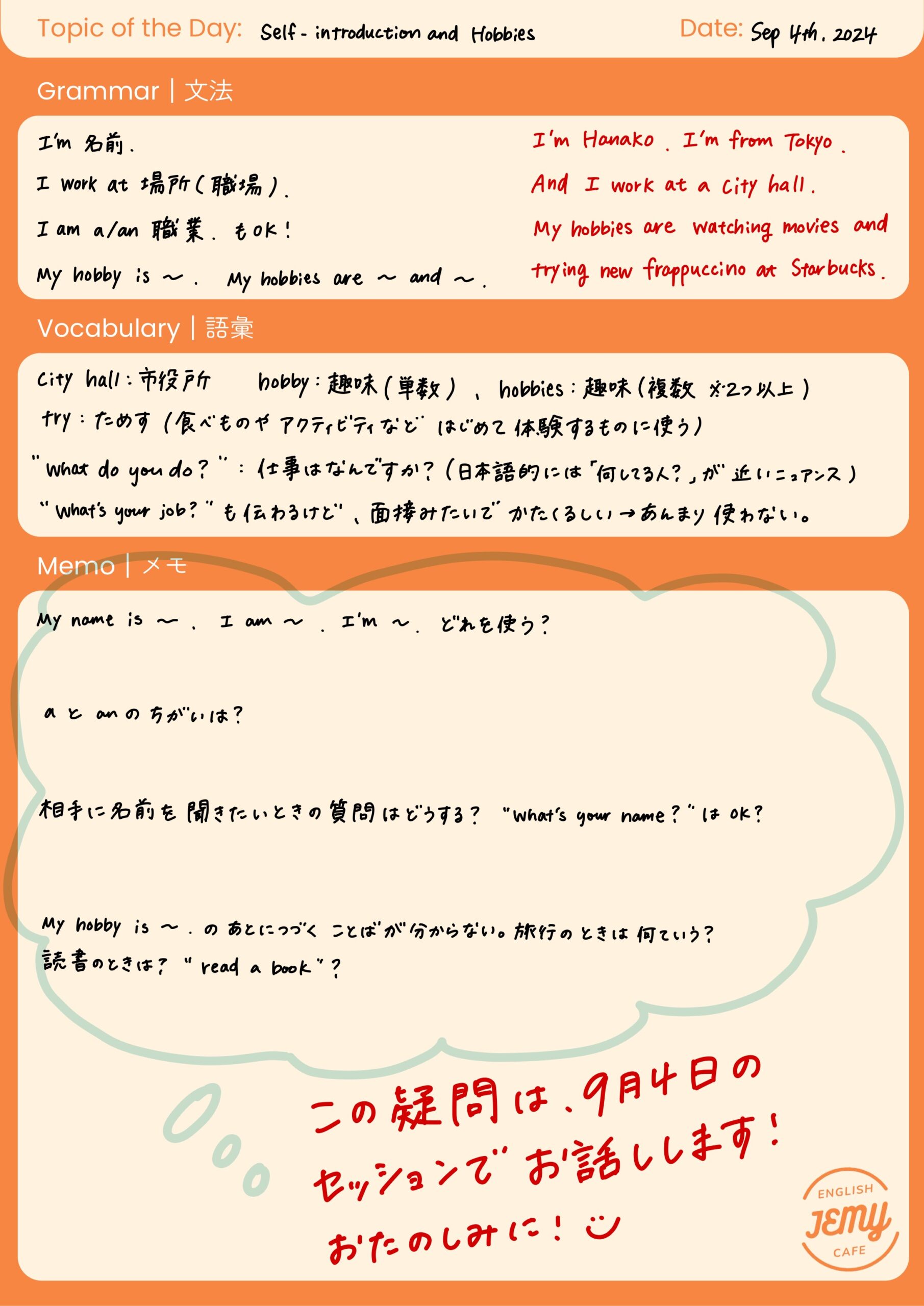 記入例では、9月4日(終了)のセッショントピックである”Self-introduction and Hobbies (自己紹介と趣味)” を記入しています。
